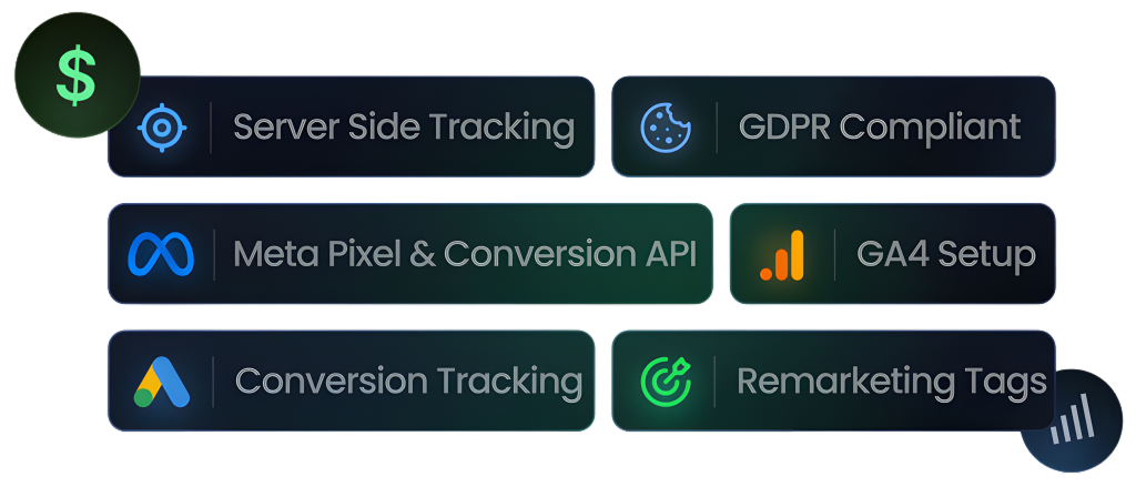 We set up comprehensive tracking for Google Ads, Meta Pixel, GA4 and other platforms so that every lead, purchase and action is accurately tracked from day one.